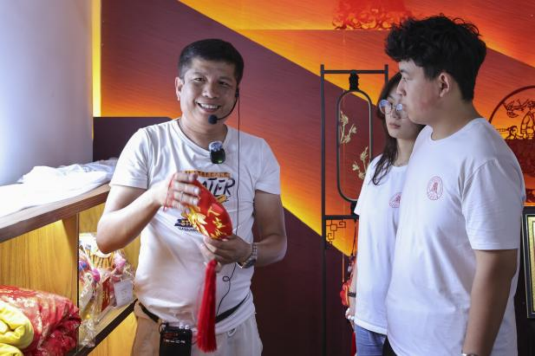 实践队员听导游讲解和顺刺绣文化