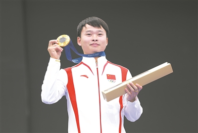 7月28日,在法国沙托鲁举行的巴黎奥运会射击男子10米气手枪决赛中,中国选手谢瑜夺冠,为中国代表团拿下第三金。图为谢瑜在颁奖仪式上。(新华社记者 赵丁喆摄)