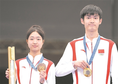 7月27日,在法国沙托鲁举行的巴黎奥运会射击10米气步枪混合团体决赛中,中国选手黄雨婷/盛李豪夺冠,赢得巴黎奥运会首枚金牌。图为黄雨婷(左)/盛李豪在颁奖仪式上。(新华社记者 鞠焕宗摄)