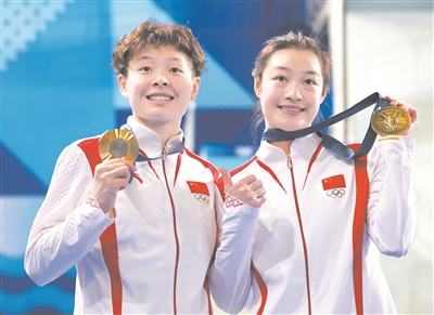 7月27日,在巴黎奥运会跳水女子双人3米板决赛中,中国选手昌雅妮/陈艺文夺得金牌,同时也是中国代表团收获的第二枚金牌。图为昌雅妮(右)/陈艺文展示金牌。(新华社记者 张玉薇摄)