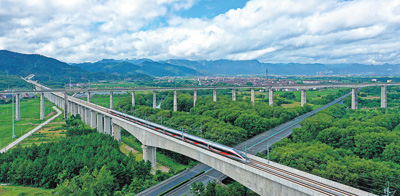 7月30日,新建杭州至温州高速铁路的首趟试运行列车G55701次从桐庐东站出发行驶至温州北站,标志着杭温高铁进入试运行阶段。杭温高铁新建铁路线长度约260公里,是长三角城际铁路网的重要组成部分。作为国家混合所有制改革试点和社会资本投资铁路示范项目,杭温高铁开通运营对于打造“轨道上的长三角”、构建浙江省“1小时交通圈”、便捷沿线人民群众出行等方面具有重要意义。图为一动车组列车行驶在杭温高铁台州市仙居县境内的线路上(无人机照片)。新华社发(王华斌摄)