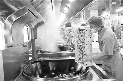 图为8月6日,北京稻香村食品厂工人在炒制熟食。(新华社记者 金良快摄)