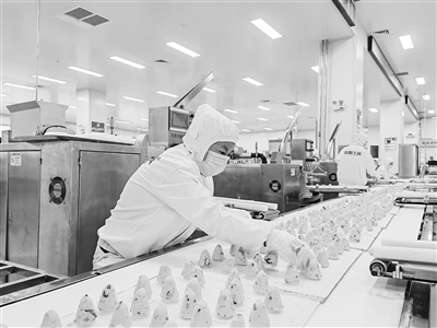 图为8月14日,青龙满族自治县双合盛生态农产品有限公司员工正在食品自动成型生产线上作业。(陈汝健摄)