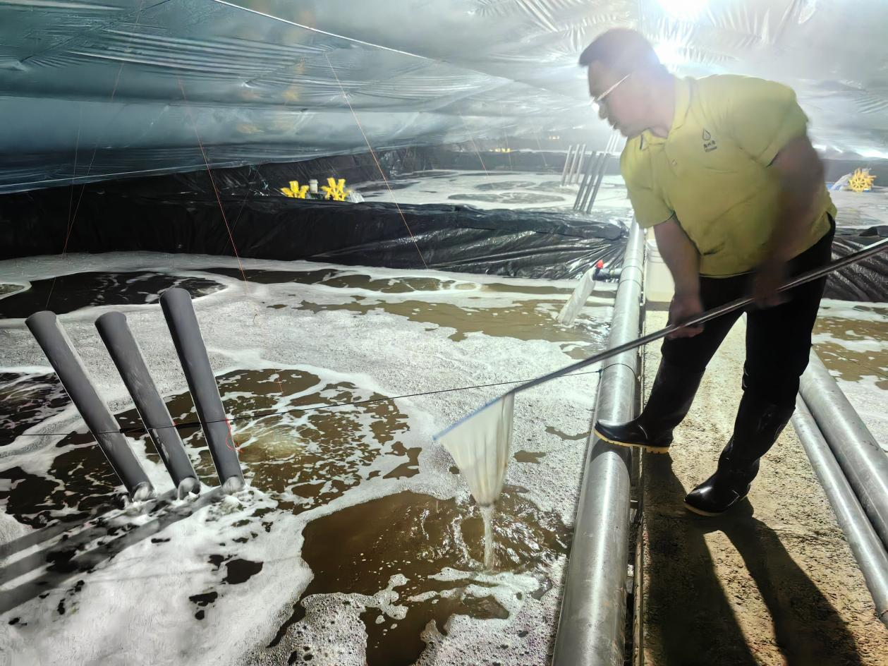 工作人员在运城海晟源新能源数字化盐碱渔业养殖产业园车间内观察虾的长势及吃料情况