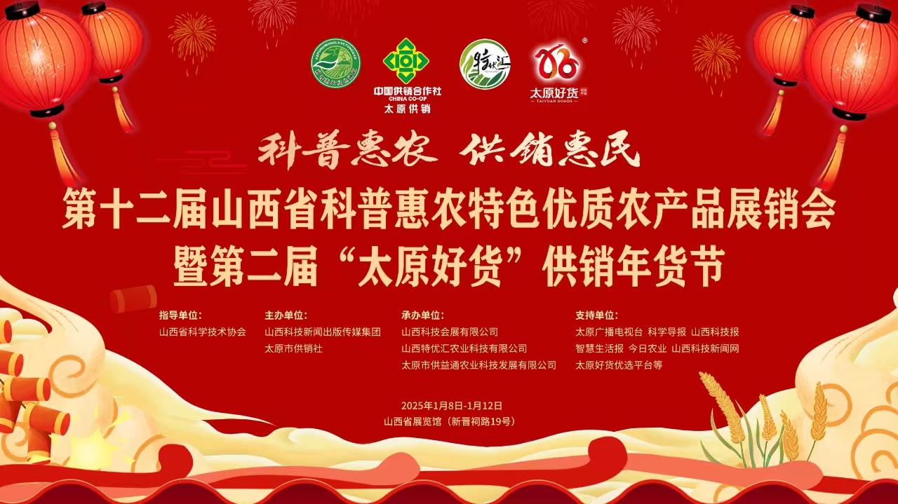 别急!一场以“科普惠农,供销惠民”为主题的第十二届山西省科普惠农特色优质农产品展销会暨第二届“太原好货”供销年货节,将于2025年1月8日至1月12日(腊月初九至十三)拉开帷幕。