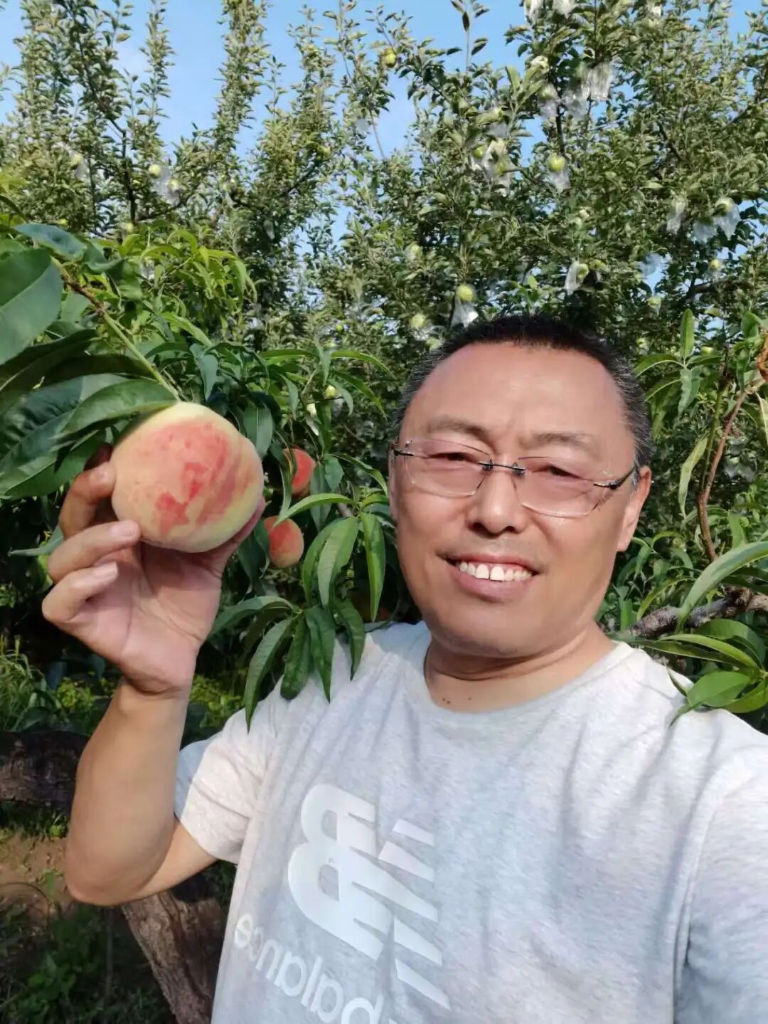 “李站长,桃子成熟了!3年前您给我们引进的‘中蟠102’的鲜桃新品种挂果了!8元一斤特别抢手!”