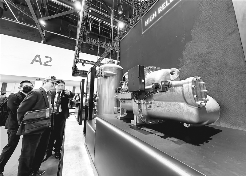 图为观众观看各种新型压缩机及配件