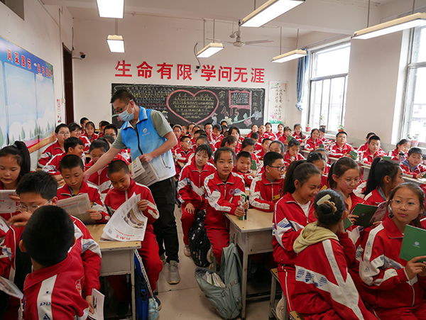▲科普志愿者为学生发放“防灾减灾知识”科普手册
