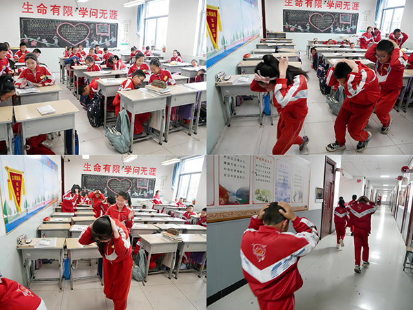 ▲学生们进行地震演练