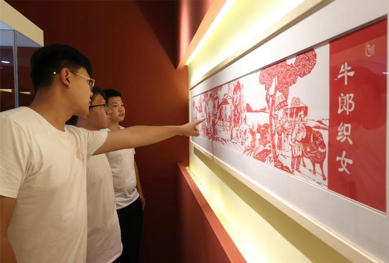 (实践队欣赏牛郎织女剪纸作品)