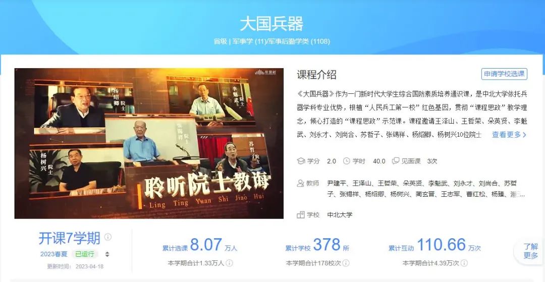 为了更好传播兵器知识,弘扬科学家胸怀祖国、服务人民的爱国精神,勇攀高峰、敢为人先的创新精神,追求真理、严谨治学的求实精神,淡泊名利、潜心研究的奉献精神,集智攻关、团结协作的协同精神,甘为人梯、奖掖后学的育人精神。中北大学在线下专门组建了由10名专业教师和20余名经过培训的青年学生组成的讲解员队伍。在线上,借助陈列室优势,学校开发建设了弘扬科学家精神的系列课程,包括《大国兵器》《大国脊梁》《军工楷模》等,并上线学习强国、军职在线、国家智慧高教、学堂在线、智慧树、超星学习通等多个在线教育平台,先后被评为省级一流课程和课程思政示范课,军地选课学校超过四百多所,选课学生人数近10万人。其中的《大国兵器》课程贯彻习近平强军思想,以“学习兵器知识,传承军工精神;聆听院士教诲,激发报国情怀”为主题,聚焦枪械、火炮、弹药等兵器知识传授,邀请王泽山、王哲荣、朵英贤、刘永才、刘尚合、苏哲子、李魁武、杨绍卿、杨树兴、张锡祥、吴一戎、芮筱亭等12位两院院士领衔主讲。让更多学生了解军事、关心军工、献身国防,培养学生的民族自豪感和社会责任感,增强学生在“推进武器装备现代化”、“建设世界一流军队”和“实现中华民族伟大复兴”进程中的使命担当,增强学生“军工报国、科技强国”的意识和情怀。 这些课程激发了民众的爱国情怀和民族自豪感,引导青年大学生把个人志向追求融入党和国家的伟大事业之中,向英雄学习、向前辈学习、向榜样学习,勇担时代使命,不畏艰难险阻,为国家富强、民族振兴汇聚起不可战胜的磅礴力量。