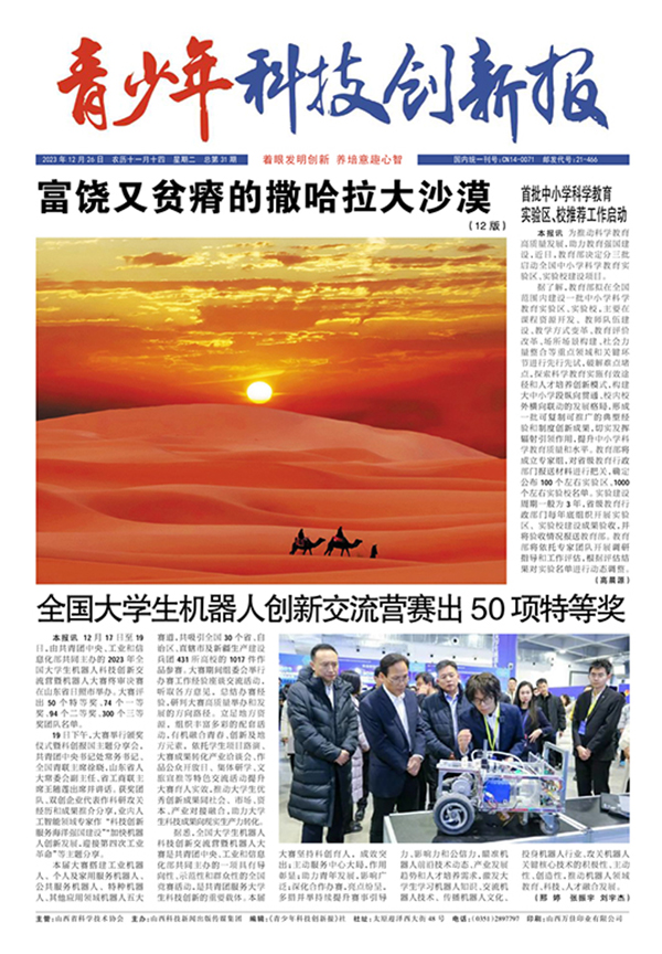 《青少年科技创新报》创刊于2023年,“科技兴则民族兴,科技强则国家强。”青少年素质是决定一个国家竞争力的重要基础。《青少年科技创新报》是一张面向青少年读者的科普类新闻报纸,由山西省科学技术协会主管,山西科技新闻出版传媒集团主办。报纸的宗旨是:着眼发明创新,养培意趣心智。《青少年科技创新报》的前身是《瓜果蔬菜报》。2023 年 2 月,经国家新闻出版署批复,正式更名为《青少年科技创新报》,接受新使命,开启新征程。