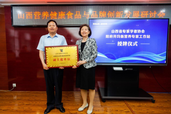 张晓清为山西大健康学会联合体副主席单位山西农大山西功能食品研究院授牌,郝建新为山西省专家学者协会阳府井均衡营养专家工作站授牌。
